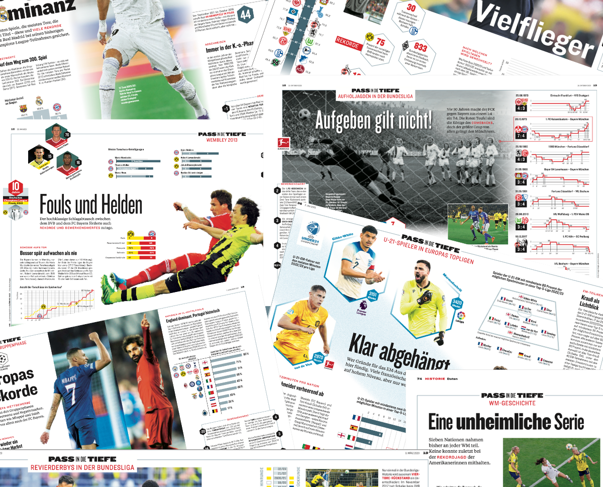 In der Print-Rubrik werden aktuelle und historische Fußball-Themen mit Hilfe von Datenvisualisierungen zum Leben erweckt.